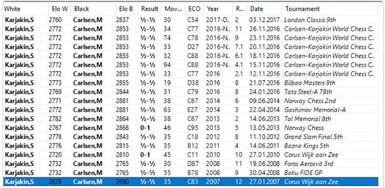 Менее чем через час, среди остальных в последнем туре, начнётся партия Карякин-Карлсен. Это будет их 20-я партия, где Сергей играет белыми. Привожу результаты предыдущих партий, где, как видим, счёт +0 -2 =17 в пользу Магнуса. 12 последних партий закончились вничью.