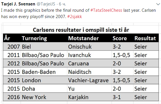 Ingvvar: Jacob08: Это была рекордная шестая победа Магнуса в Вейке - см. исторический список победителей - а в целом его 29-я победа в супертурнирах.