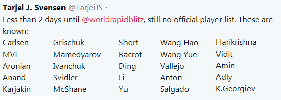 Немного изучил доступные новости, последние - ноябрьские (топы должны были подтвердить участие до 25 ноября), тогда подтвердили участие Магнус, Левон, Шах, Виши, и прошлогодние победители - Карякин и Иванчук.