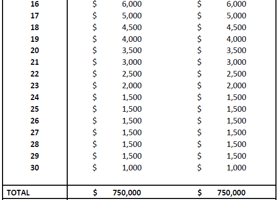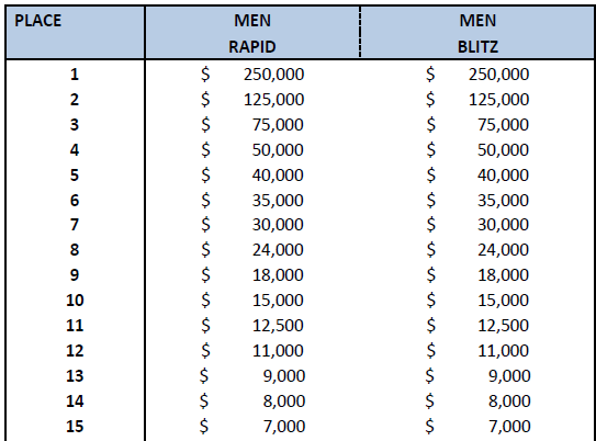 Первая премия в каждом из чемпионатов у мужчин составляет $250,000, что более чем в шесть раз превышает соответствующую премию прошлого года. Если кому-то будет сопутствовать невероятная удача в победе на обоих чемпионатах за эти пять дней, то такой победитель в итоге заработает сумму, близкую той, которую чемпион мира получил за победу в матче в Нью-Йорке.