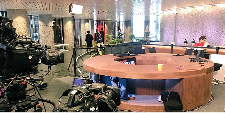 Впечатляет мраморный стол, на котором расположена шахматная доска. Специально построен овальный дубовый интерьер для ТВ-ведущих и гостей в студии.