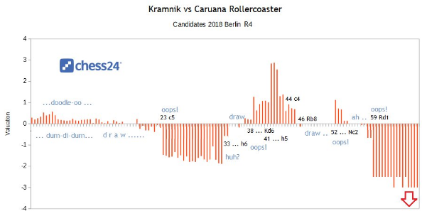 2. Если после трех туров, по-моему, было рановато делать выводы и прогнозы, то теперь информации стало чуть больше. И по игре, и по очкам Каруана впереди. Довольно справедливо. И это с учетом того, что он отыграл с Крамником и Мамедъяровым - теми, кто пока в плюсе. Будем наблюдать, справится ли итальянец с нервами.