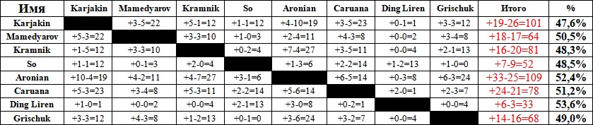 (Зевая) Посмотрите на досуге сколько супертурниров выиграл Карякин, сколько - Гельфанд, и сколько - МВЛ. Табличка Якоба Вам в помощь. |