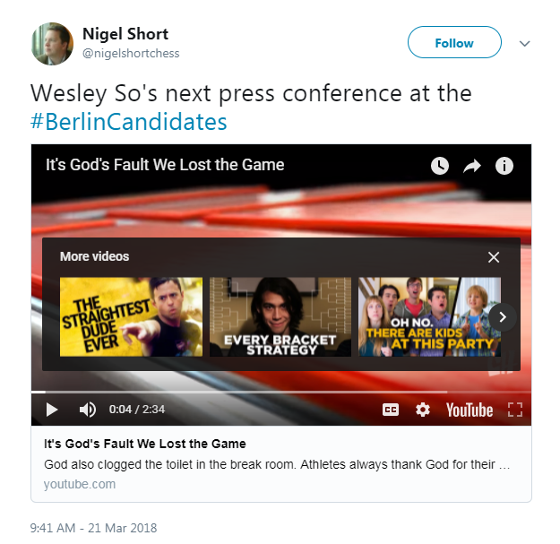 Я считаю, что, если Каруана не будет сушить, то он будет идиотом допустит ошибку. Говорю об этом до партии, в отличие от. Ничья в партии с Шахом и 2.5 очка в оставшихся встречах дадут ему почти железобетонное первое место. Скорее всего, даже 2 очка, если это не будут 4 ничьих. А вот проигрыш Шаху - и шансов сразу становится очень мало.