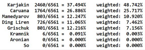 @chess24com @chessbrahTV Hello, all! I have written a program that analyzes the 6561 remaining possible outcomes of #Candidates2018 . See http://eji.com/chess for the results, including everyone's current chances, the very slim chance for a playoff, what-ifs. and more. |