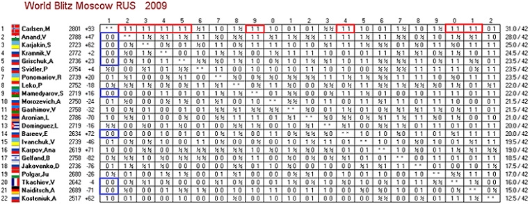 Мне запомнился тот уникальный турнир, ведь в одном из сильнейших в истории блиц-турниров Карлсен, в свои неполные 19 лет, по-фишеровски утюгом прошелся по мировой элите - вгляните на имена побеждённых и отрыв в сумме !