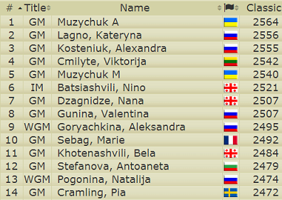 Список фаворитов возглавляют Мария Музычук (Украина, 2540), Нино Бациашвили (Грузия, 2521), Нана Дзагнидзе (Грузия, 2507), Валентина Гунина (Россия, 2507), Александра Горячкина (Россия, 2495), Мари Себаг (Франция, 2492), Бела Хотенашвили (Грузия, 2484), Антуанета Стефанова (Болгария, 2479), Наталья Погонина (Россия, 2474), Пиа Крамлинг (Швеция, 2472), Моника Сочко (Польша, 2471), Ольга Гиря (Россия, 2470).