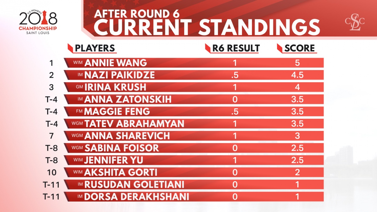 Пока что Wang топчет признанных аутсайдеров, а из "признанных фаворитов" сыграла только с Абрахамян (вничью). Ещё обыграла первую юниорку США (сама она - вторая). |
