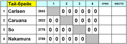 В случае наличия трёх или более участников, разделивших первое место, тай-брейк состоится на следующий день т.e. в пятницу 8 июня. Таким образом если, например, все сегодняшние партии закончатся вничью и Карлсен, Каруана, Со и Накамура наберут равное количество очков, то им, для определения победителя турнира, предстоит провести двухкруговой блицтурнир по следующей схеме с регламентом партий, аналогичным блицтурниру в день открытия.