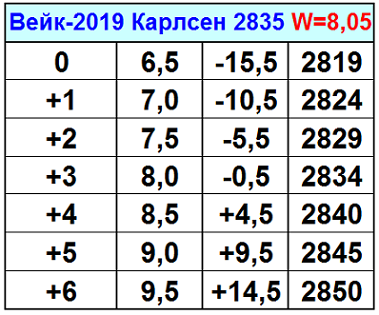 Согласен естественно, потому-то и написал "теоретически вполне может" + табличку "рейтинговые перспективы" в Вейке дал. А там-то, как обычно, рассмотрены последствия почти всех правдоподобных исходов в турнире - скоро перенесу её кстати в целевую ветку. Зато, если удастся 2850 в Вейке - что разумеется маловероятно по заказу - то тогда, в оставшиеся 11 месяцев 2019 года, можно начинать подумывать о нечто большем. Например, вспомнить о собственном мировом рекорде 2882.