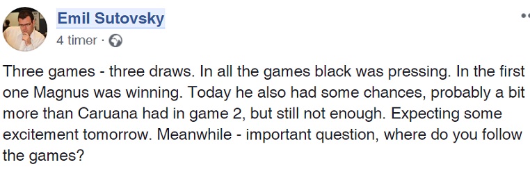 The match is trending slightly in Carlsen's favour. Some commentators go further. For instance, on ChessPro Michał Krasenkow has compared Caruana to Euwe ("an extremely pleasant young man and an outstanding player but lacking a unique personal style and a champion's charisma").