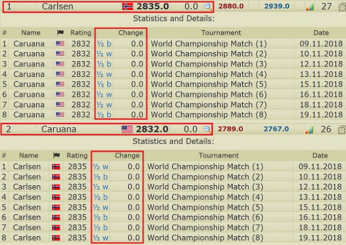 Таким образом, ввиду узости интервала (FIDE diff. 0-3), ничейные партии в Матче не будут вносить изменения в текущие величины рейтингов - лишь победы/поражения повлияют на рейтинговый статус участников в списке на 1 декабря.