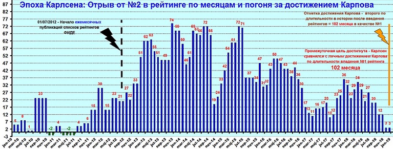 Обеспечив себе №1 на 1/12-2018, Карлсен достиг отметки 102 (сравнялся с Карповым) месяца владения вершины списка рейтингов. Таким образом: