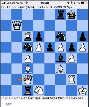 And here my engine can't find anything better than: 42...Qe8 43.Bxf4 gxf4 44.Qxc1 Qe1+ 45.Kh2 Qh4+ 46.Kg1 Qe1+ 47.Kh2 @ depth 22/76. This line might be an argument for playing 40...Qa7 instead of 40...Qa8. But then in the video Kasparov claims that 40...Qa8 is so he might have had something in mind against 40...Qa7. |
