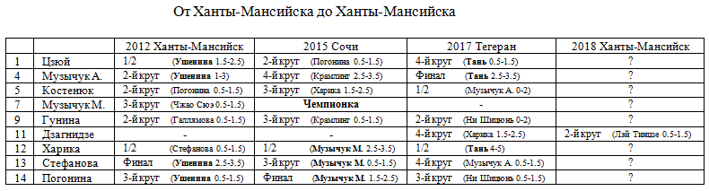 Она, в общем-то, не изменилась: шансы есть только у Тохиржоновой. Стало их, правда, побольше, зато у молодых китаянки и иранки поменьше (у китаянки, честно говоря, нет вовсе). |