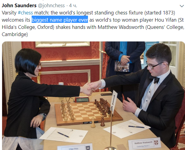 | Почитатель: Хоу Ифань играет на 1-ой доске Оксфорда в the 137th Varsity #Chess Match, Oxford v Cambridge |