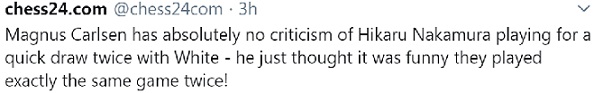 Но я бы не вешал ответственность только на Накамуру, с которого, как с гуся вода. Карлсен тоже соучастник, а у него моральный авторитет на порядок выше. Кто мешал ему играть дальше или на выигрыш? Мне представляется, что Каруана, например, так бы не поступил. |