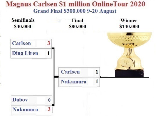 Конечно, после сегодняшнего 4:1 в пользу Магнуса весьма маловероятно (и дело не только в счёте, но и в игре), разве что Накамура психологически сломается и посыплется. Посмотрим. |