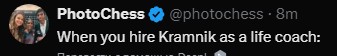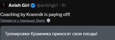 Он рассказал о турнире Sinquefield Cup 2022 года: генеральный менеджер Рустам Касымджанов , который его тренировал, отправил ему текстовое сообщение перед игрой с Карлсеном: «Проверь каталонца. Попробуй что-нибудь странное», — объяснив, почему он так хорошо подготовился к открытию.