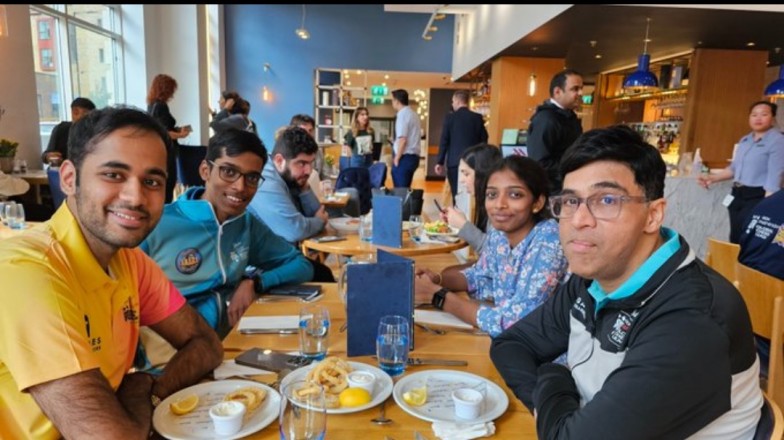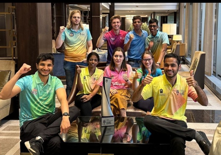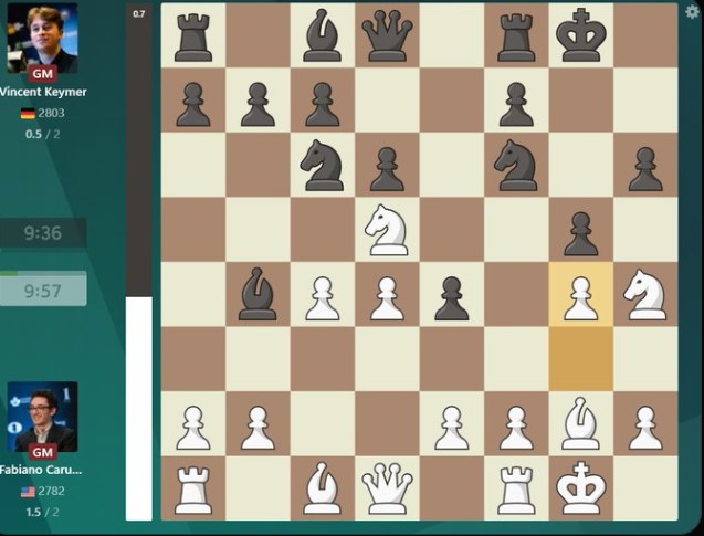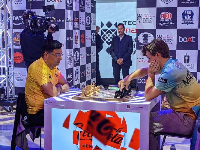 World no.1 @MagnusCarlsenmakes his way to the @AlpineSGPipersdugout, speaks with his trainer @PHChessNielsen. Just a few moments to go before their match against @GangesGMskicks off