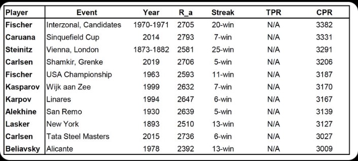 The table below shows best historical performance rating from win streaks. Elo ratings before the official ratings were introduced are taken from Chess Metrics.