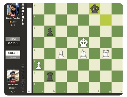 Excellent presence of mind by @NihalSarin! In a position where he was winning on the board against Daniel Dardha but very low on time, he stops the clock with 2 seconds left and claims a draw. The draw is given PBG@balanalaskankKnights defeat @AlpineSGPipers9-7!