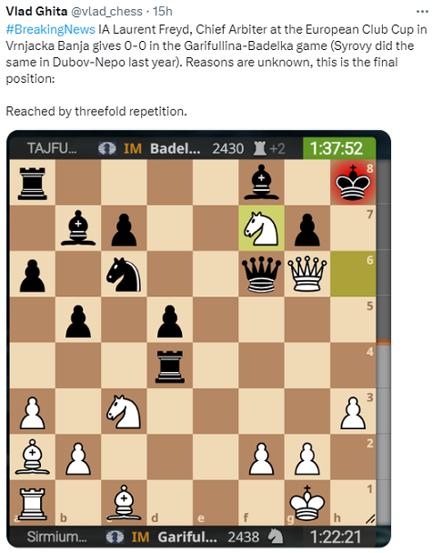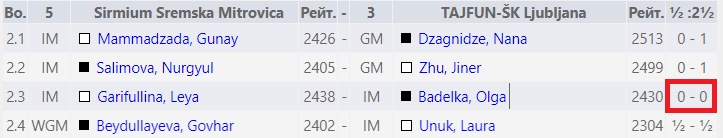 ...game between IM Leya Garifullina (2438, Sirmium Sremska Mitrovica) and IM Olga Badelka (2430, TAJFUN SK Ljubljana) was declared by the Chief Arbiter with 0-0 result because the players concluded on a draw before move 30, without a proper claim involving an arbiter. The players were forfeited according to art. B3.2 of the ECU rulebook.