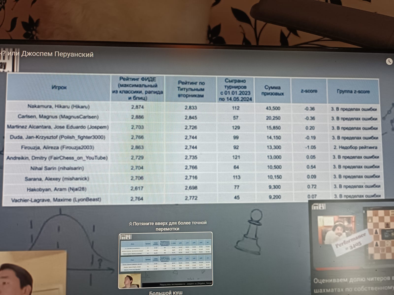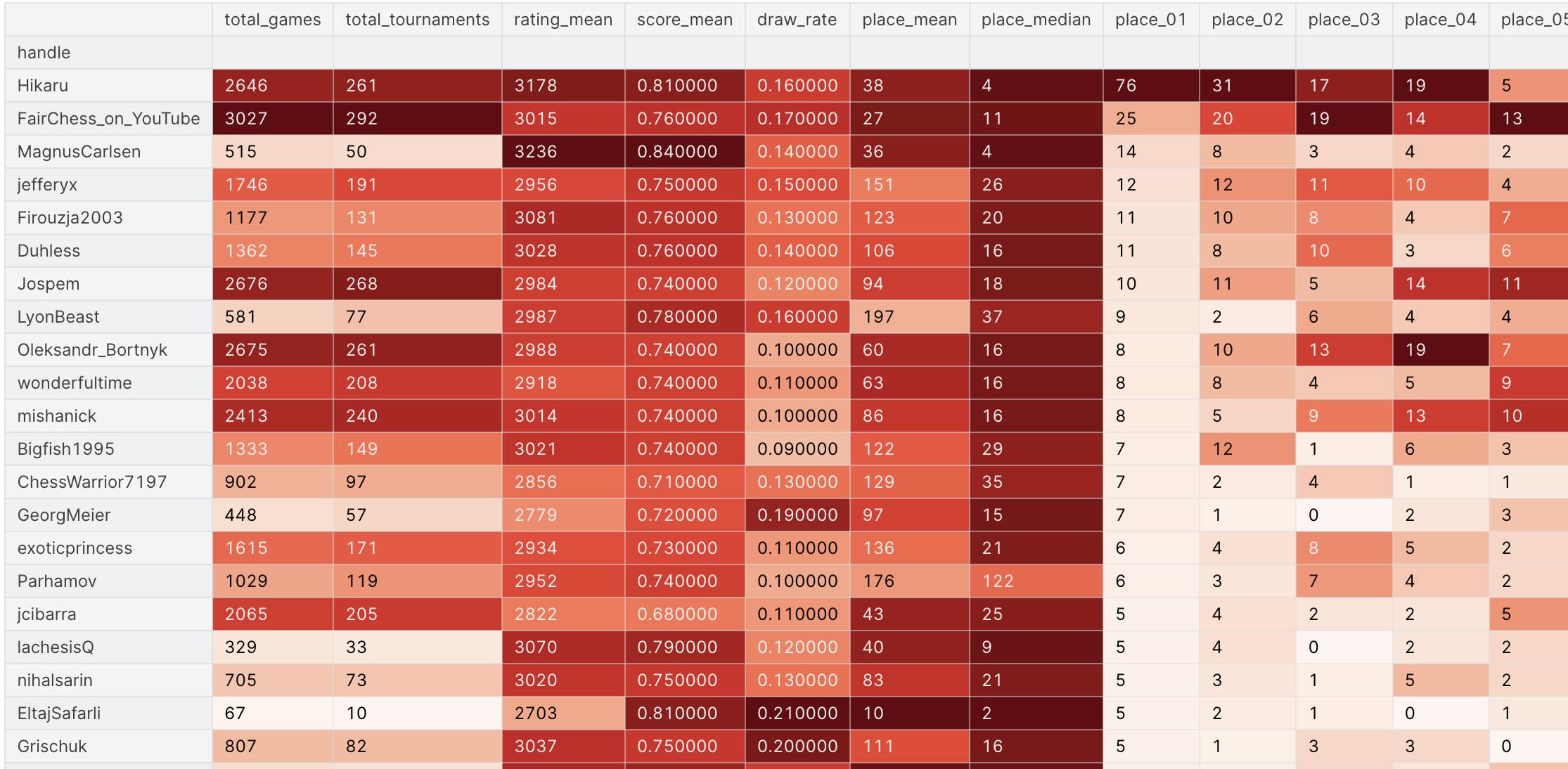 По самой статистике вопросов нет, правда ее никто не проверял, другое дело некоторые способы ее использования вызывают вопросы, но это надо подробно обсуждать ролик, есть конкретный общий вопрос, действительно количество процент побед и призов в ТТ Жоспема значительной ниже ,чем у того же Хикару , не должен ли этот показатель объективно снижаться с увеличением количества попыток ?То есть сумма призов растет , а средний результат падает из-за элементарной усталости от регулярного участия, сами ТТ превращаются для участника в рутину, имхо при практический постоянном участии невозможно сохранить оптимальный настрой и мотивацию, ну конечно если ты не Накамура