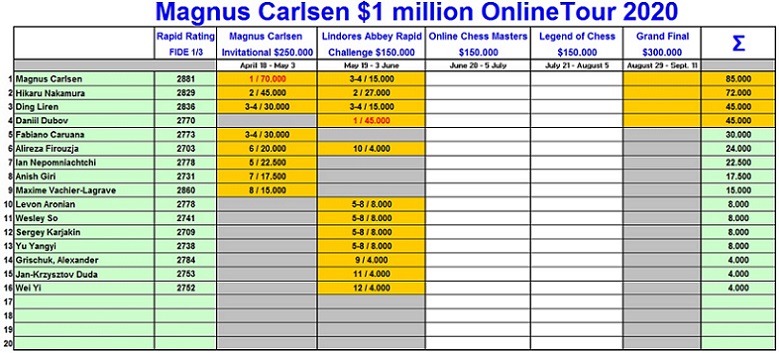 На лакомый) по премиям заключительный турнир серии Magnus Carlsen OnlineTour 2020 "Grand Final $300.000" допускаются лишь четыре участника-победителя предыдущих четырёх турниров серии, и сейчас, после двух турниров, это пока Карлсен и Дубов. На случай, если кому-либо из них (или обоим) удастся победить ещё и в оставшихся двух турнирах, по Положению ведётся несложный дополнительный подсчёт очков, учитывающий суммарное выступление участников в серии для доступа в "Grand Final $300.000". |
