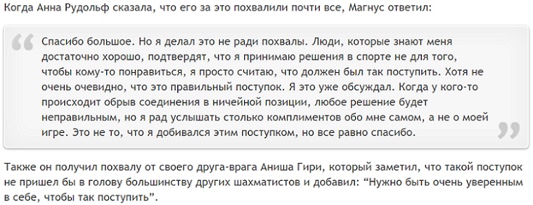 Ну да! Но я бы не подчёркивал здесь что-то выдающееся. Нормальная реакция нормального человека. Разве, что Магнус нашёл оригинальное оформление. |