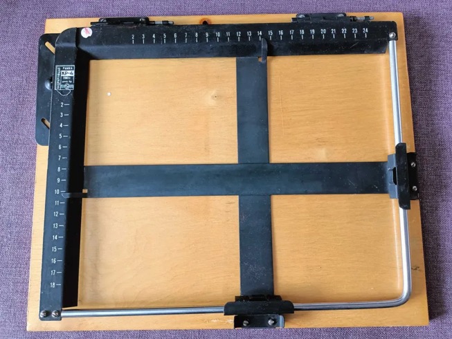 Фотоувеличители в СССР продавались либо с вертикальной штангой, либо с кронштейном. Почему-то передвижение оптики относительно плоскости фотобумаги предлагалось только этими двумя способами. Я купил Ленинград-2 с кронштейном. У товарища был со штангой и покупали для меня мы вместе. Уж не помню почему остановились на этой модели, может, потому, что он стоил всего 17 рублей и нужно было купить еще красный фонарь, ванночки и доску с кадрирующей рамкой. Такой: