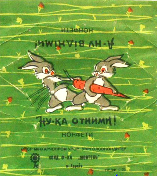 Именно в такой обертке. Это я сейчас уже знаю, что в стране они были с разными фантиками, и даже шоколад был с таким названием. И что наиболее популярная картинка была с девочкой и собачкой, а эта с двумя зайцами и морковкой, как раз редкая. Ибо причем тут морковка?