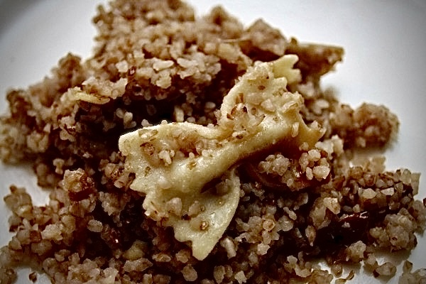 Ну и, чаще всего, это варнечки (варнишки, варнишкес), отварное тесто с гречкой и всё вместе еще дополнительно обжарить. Конечно, тесто не было в виде бантиков, оно было большими плоскими кусочками: