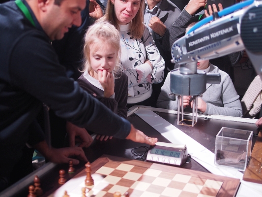О роботе. Хорошая находка, выглядевшая особенно выгодно на фоне... всего остального. Сценки, разыгрывавшиеся там, были чрезвычайно забавны, особенно битва с "железкой" Рауфа Мамедова (руками Кирилла Зангалиса). Оказалось, что обыграть (даже Шреддер) гроссмейстеру мирового уровня не так просто, а вот использовать несовершенство конструкции робота - матерый боец смог. Он сначала построил крепость с ладьей и двумя пешками против ферзя, а потом (имея полминуты против трех у робота), банально срубил ему флаг (робот либо вообще не умеет предлагать ничью, либо не научен это делать с лишним ферзем).
