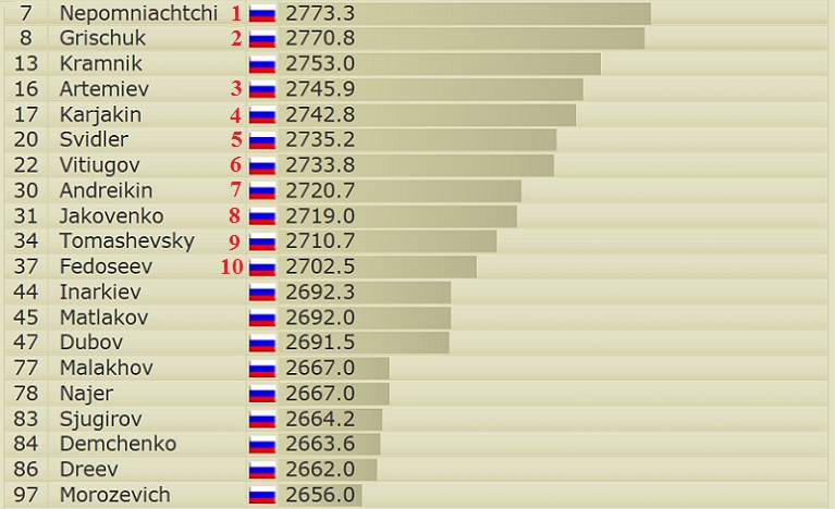 | Бесстрастно отмечаю, что 1 апреля рейтинг Карякина впервые опустится ниже отметки 2750 (начиная с 1 ноября 2010, когда он вступил в "клуб 2750+"). |