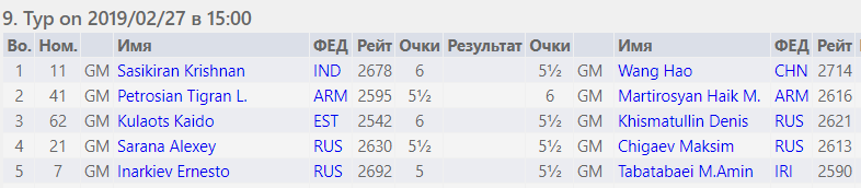 (Пропущенные в таблице имена соперников: Иван Сальгадо [4 тур], Константин Ланда [7 тур])