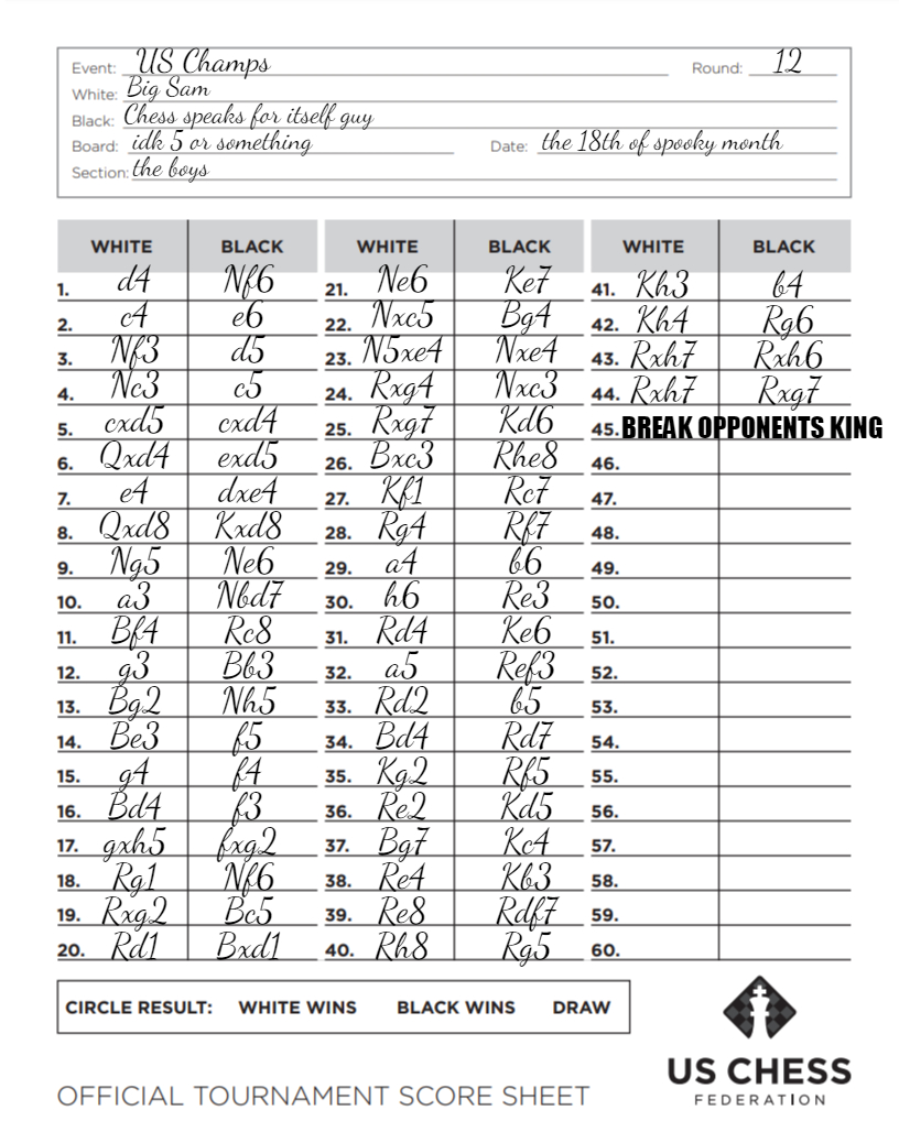 In the post-game interview, Niemann explained it was a misunderstanding between the players. “The pin of the King was fallen off, so he’s just picked it up, but I was just a bit annoyed because it was on my time“. He revealed that Samuel wanted to glue the piece, but the game continued as soon as he put the King back on the board.