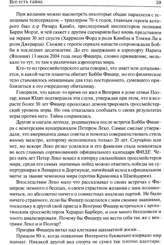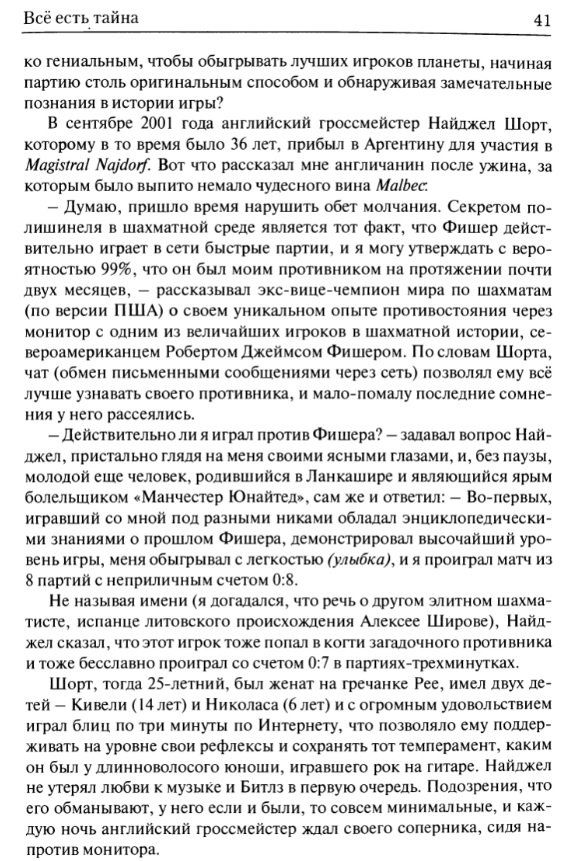 | Главным же деморализующим фактором для противников Фишера была его игра — быстрая, уверенная и казавшаяся безошибочной. Короче говоря, мое второе место рассматривалось как победа, поскольку Фишер был из «другой Галактики». |