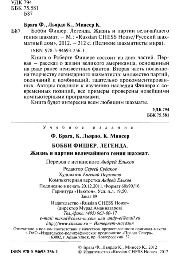 Ф. Брага, К. Льердо, К. Минсер Бобби Фишер. Легенда. Жизнь и партии величайшего гения шахмат, Москва, 2012