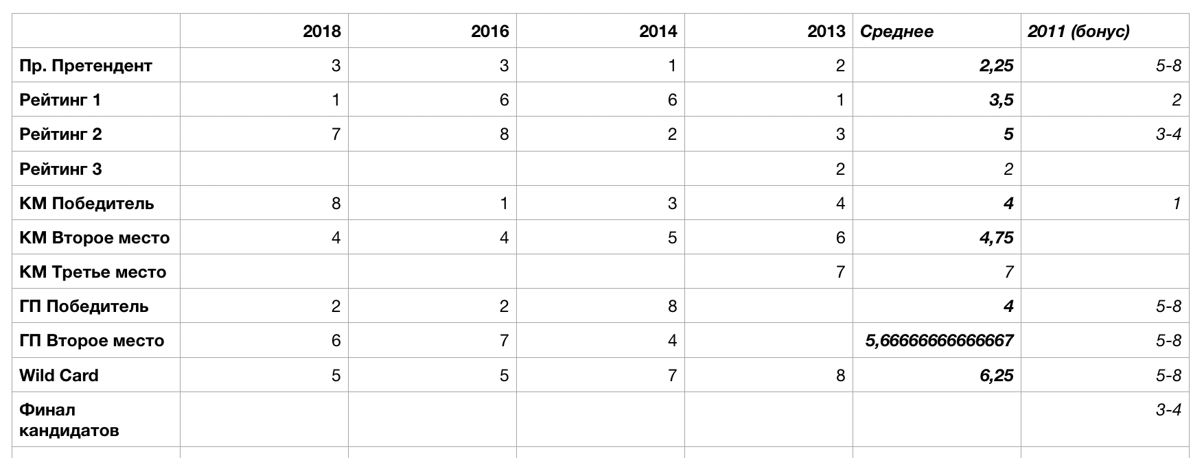 Вот статистика за последние 4(5) ТП. Маленькая выборка, конечно, но все равно. Да, кажется, что Wild Card обычно проседает, но рейтинг 1 вообще 2/4 раз турнир выиграл, а второй по рейтингу в половине случаев входил в топ-3. И судя по последним 4 ТП, только прошлый претендент стабильно хорошо играет, с остальными вообще не угадаешь. Так что может уже стоит закончить эти "глубокие" споры о том, как надо и не надо отбирать в ТП?
