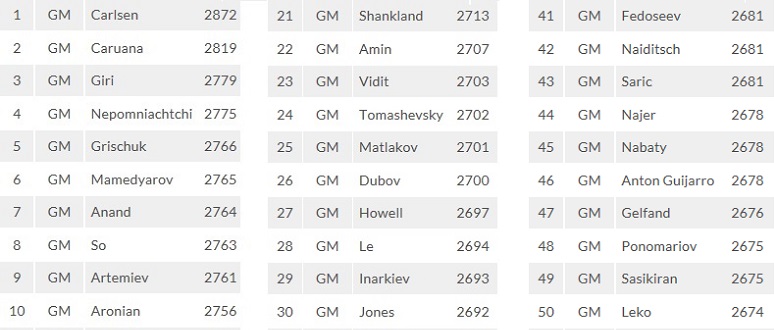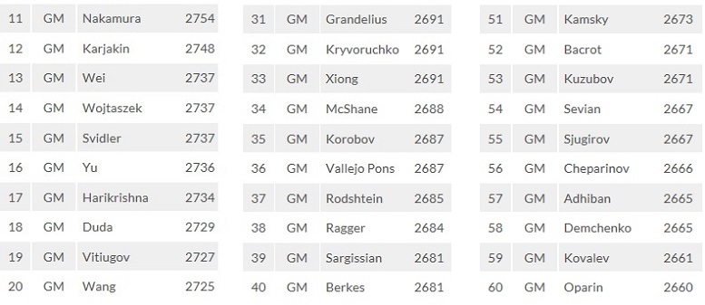 Топ60 турнира, среди участников которого 26 шахматистов из клуба 2700+ на 1/7-2019. Полный список насчитывает 160 участников.
