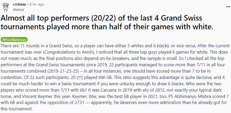 Человек провел небольшое исследование. Выяснил, что в четырех Больших Швейцарках (2019-2025) больше, чем 7 очков, набирали 22 участника. Так вот: в 20 (!!) случаях из 22-х, такой участник играл 6 партий белыми и 5 партий черными (и лишь в двух случаях - наоборот).