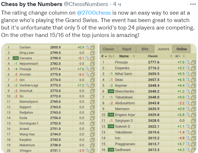 | Полагаю, что Евгений в любом случае вряд ли отобрался бы в ТП, при всём уважении к нему как к шахматисту и человеку. А вот Фирузджу мне видеть там очень хочется, потому что он весьма глубокий и творческий шахматист. |