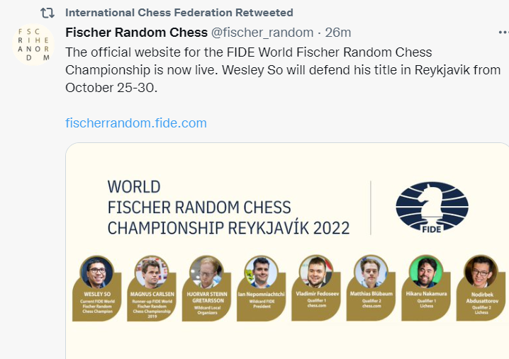 Fischer Random WC full lineup: Wesley, Magnus, Hikaru, Fedoseev, Abdusattorov, Blübaum, Nepo, Grétarsson.