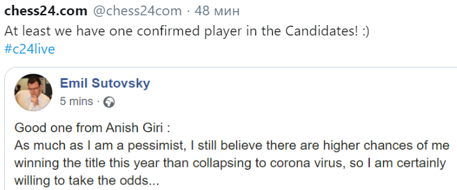 "Он прямым текстом первым информировал ФИДЕ, что выбывает из турнира (не сомневается или беспокоится, а выбывает).