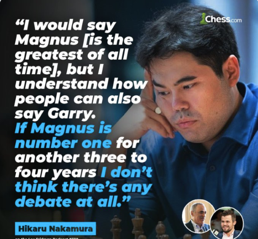 | По поводу слов Хикару: в шахматах та же фигня что в футболе - спор о ГОАТ бесконечен, и у каждого будет вполне обоснованное своё мнение. |