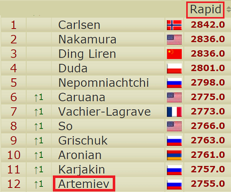 На 12 месте в мире по быстрым Артемьев. Где он его набрал и как в ЧМ выступал разбираться лень. Последние 2 года вживую подвиги демонстрировать было довольно затруднительно.