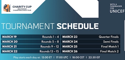 Программа Карлсена на первые четыре дня кругового отборочного турнира благотворительного кубка UNICEF, 2-го турнира в рамках серии Meltwater Champions Chess Tour 2022 года.