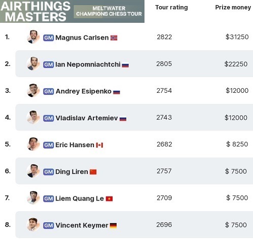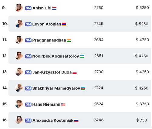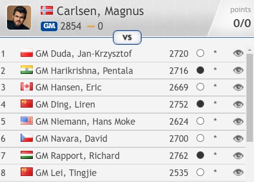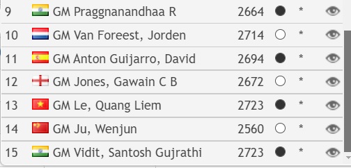Состав: Магнус Карлсен, Рихард Раппорт, Дин Лижэнь, Ле Куанг Льем, Сантош Видит, Пентала Харикришна, Йорден ван Форест, Давид Навара, Радослав Войташек, Давид Антон Гихарро, Гавейн Джонс, Эрик Хансен, Рамешбабу Прагнанандха, Ханс Ниман, Цзюй Вэньцзюнь, Лэй Тиньцзе |
