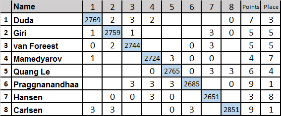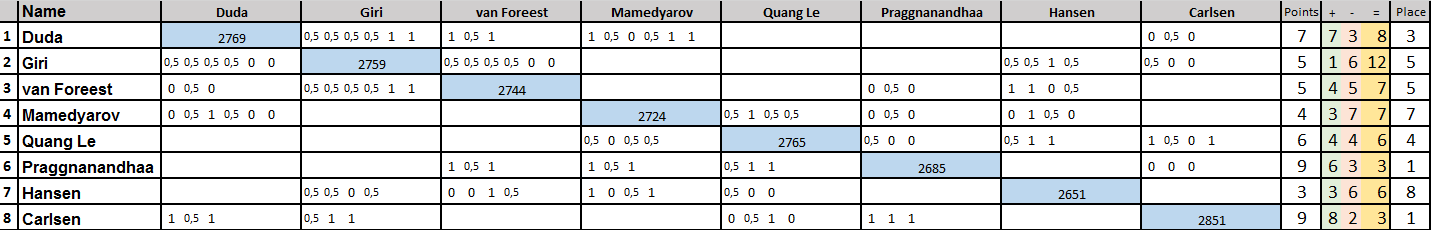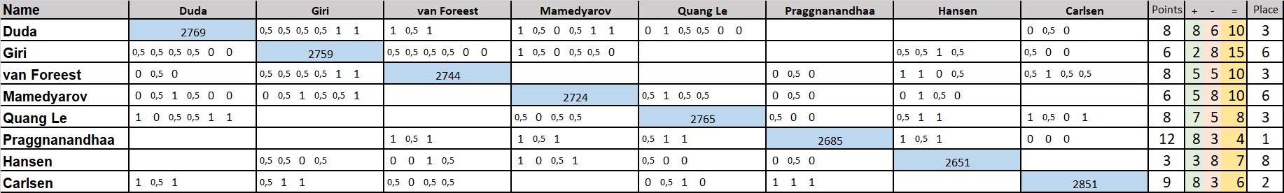 1. Прагнанандха - 9 (100%) ; 2. Карлсен 6 ; 3.Дуда 5 ; 4. Гири 4 ; 5-8.Ле Куанг Льем, ван Форест, Хансен, Мамедьяров - по 3. |